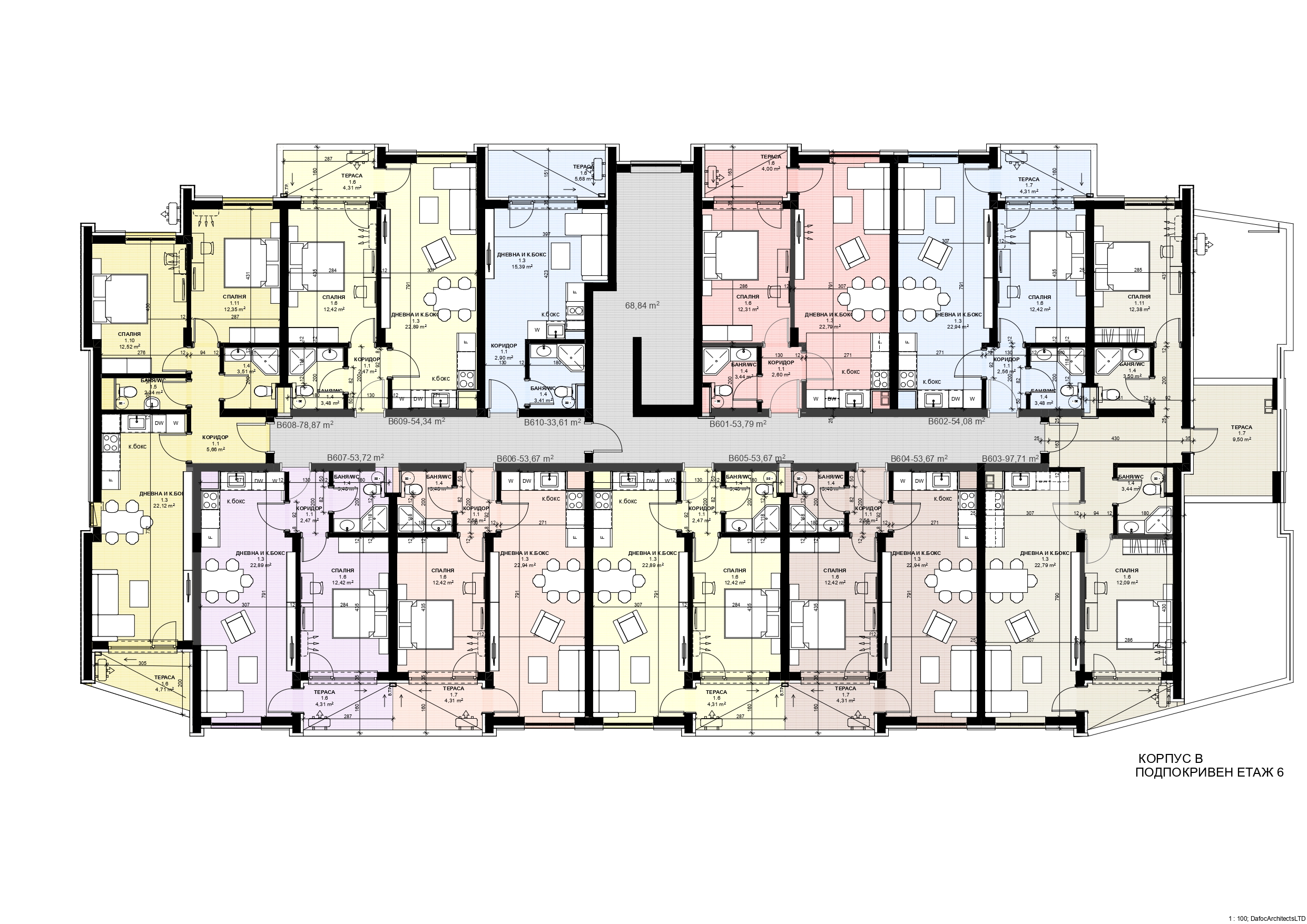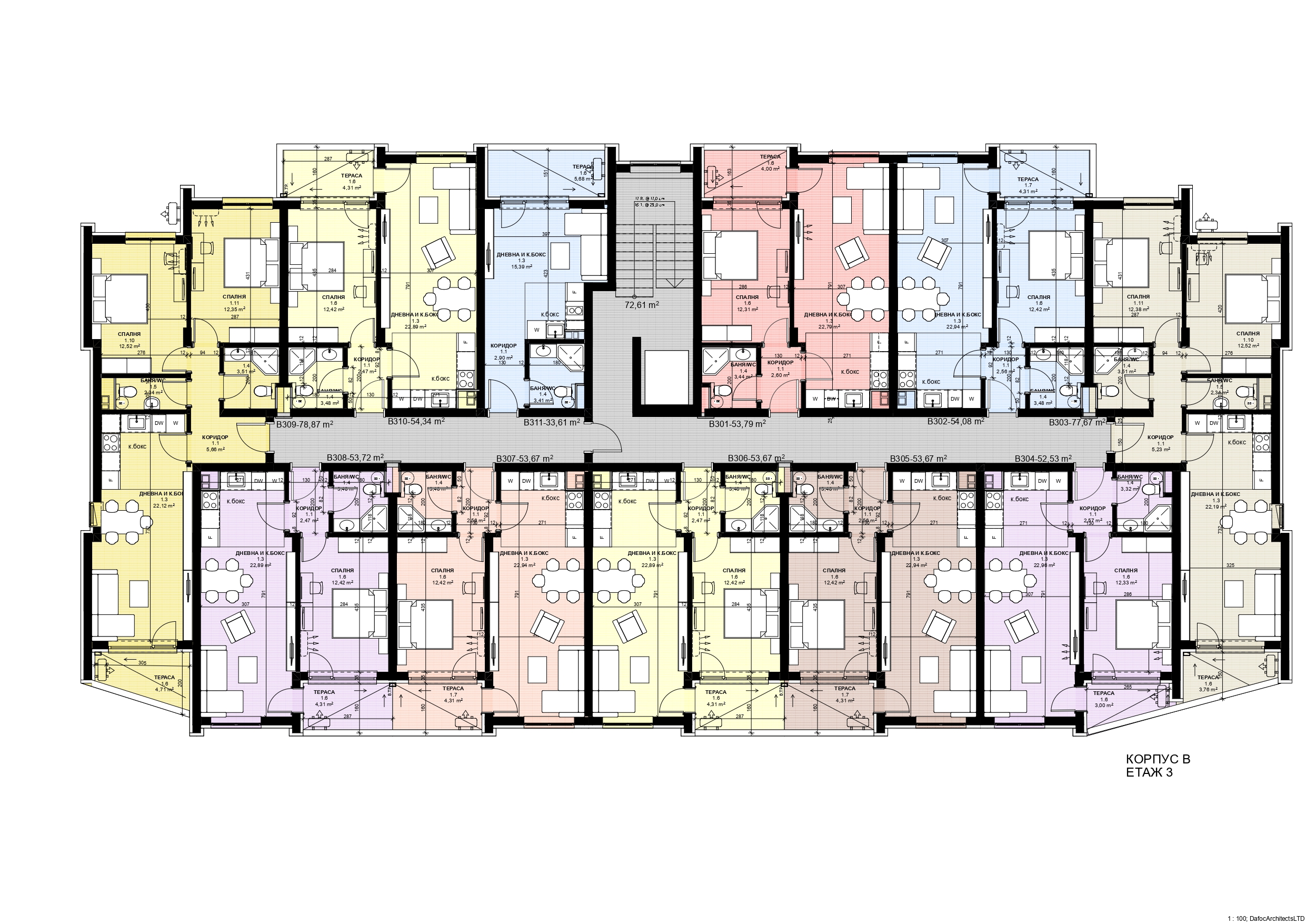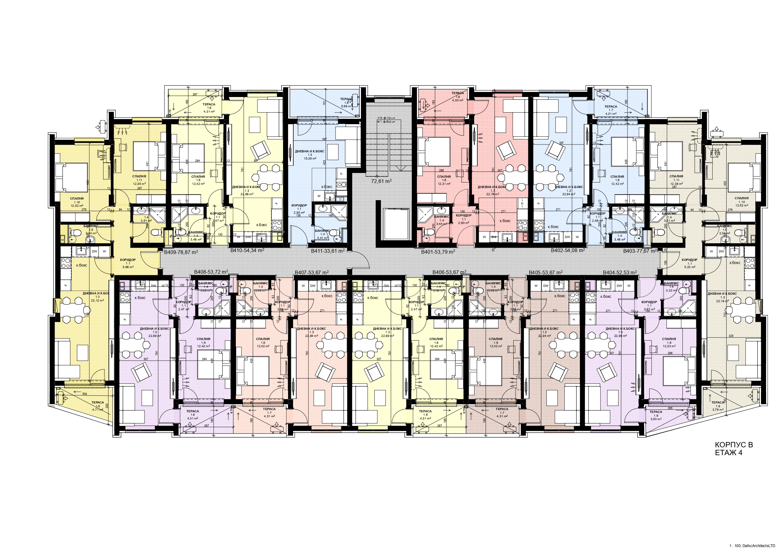 В комплексе предусмотрено 129 квартир с различными планировками — студии, одно- и двухкомнатные апартаменты. Каждая квартира продумана до мелочей и имеет просторную террасу, создающую дополнительное пространство для отдыха. Разнообразие площадей и ориентаций позволяет подобрать оптимальный вариант для любых нужд.