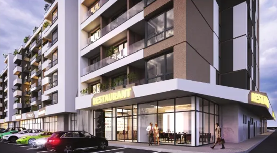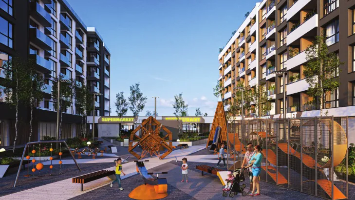 Современные фасады и панорамное остекление обеспечивают много естественного света. На первом уровне запланирована торговая галерея с супермаркетом, рестораном и магазинами. Внутренний двор оформлен ландшафтным дизайном, предусмотрены зоны для воркаута и безопасные детские площадки.