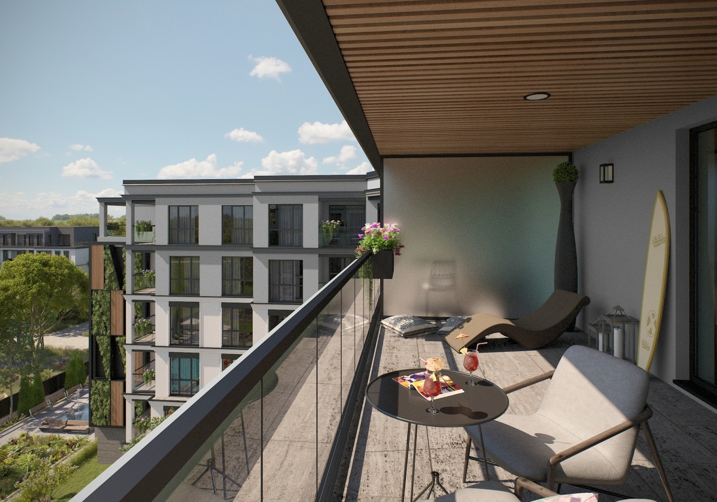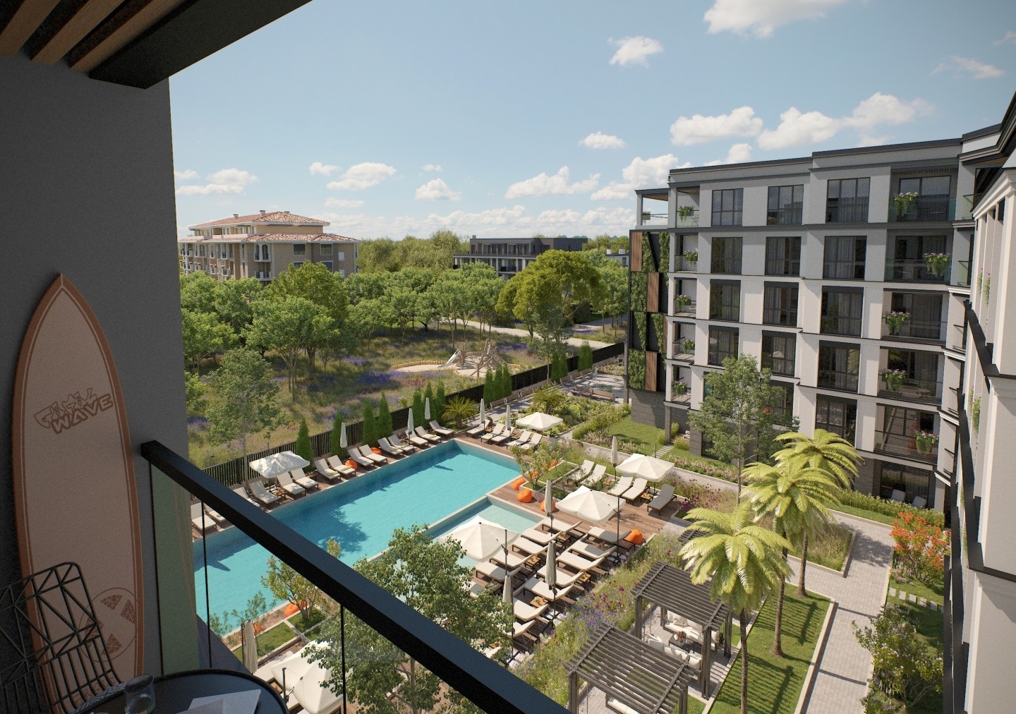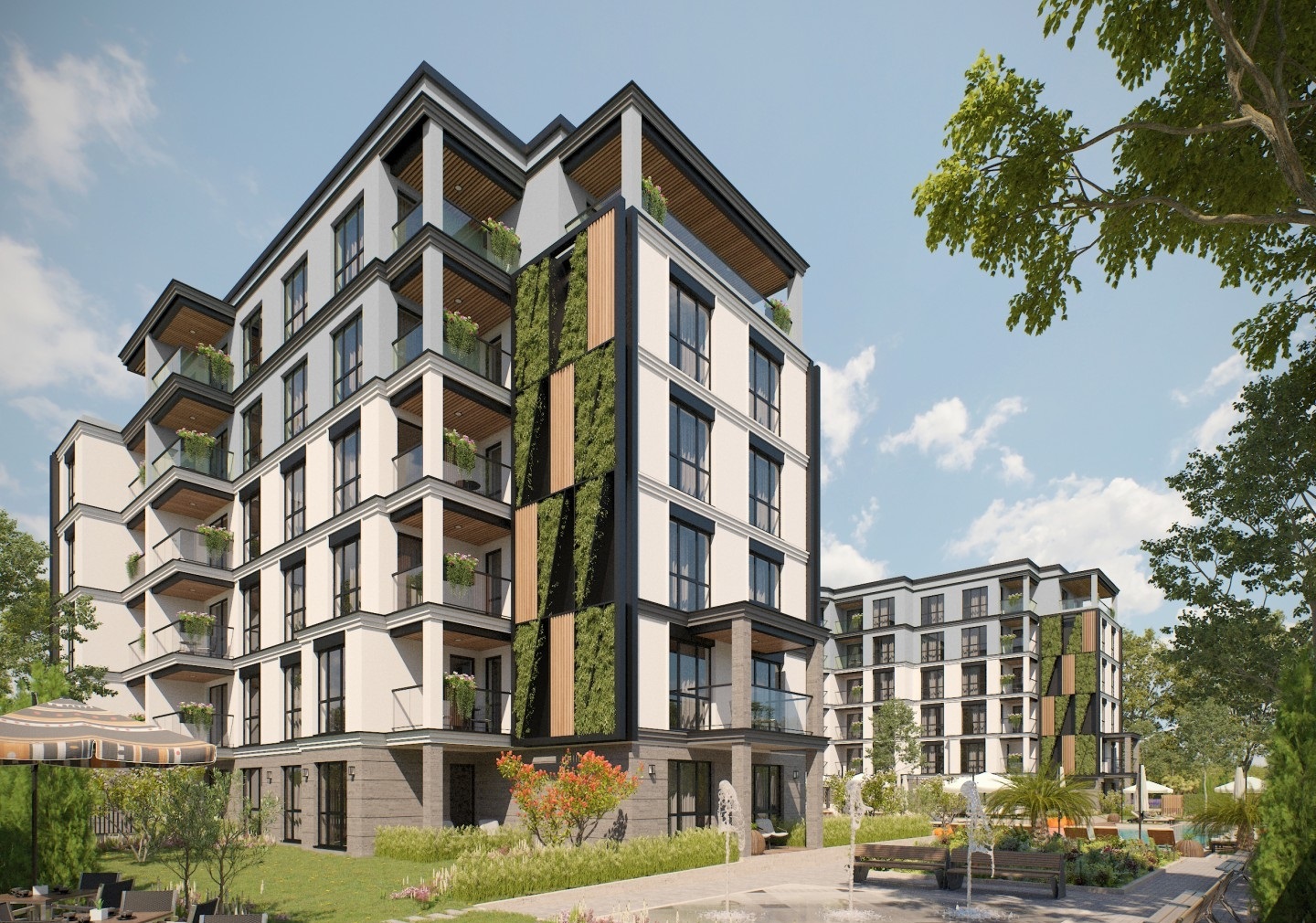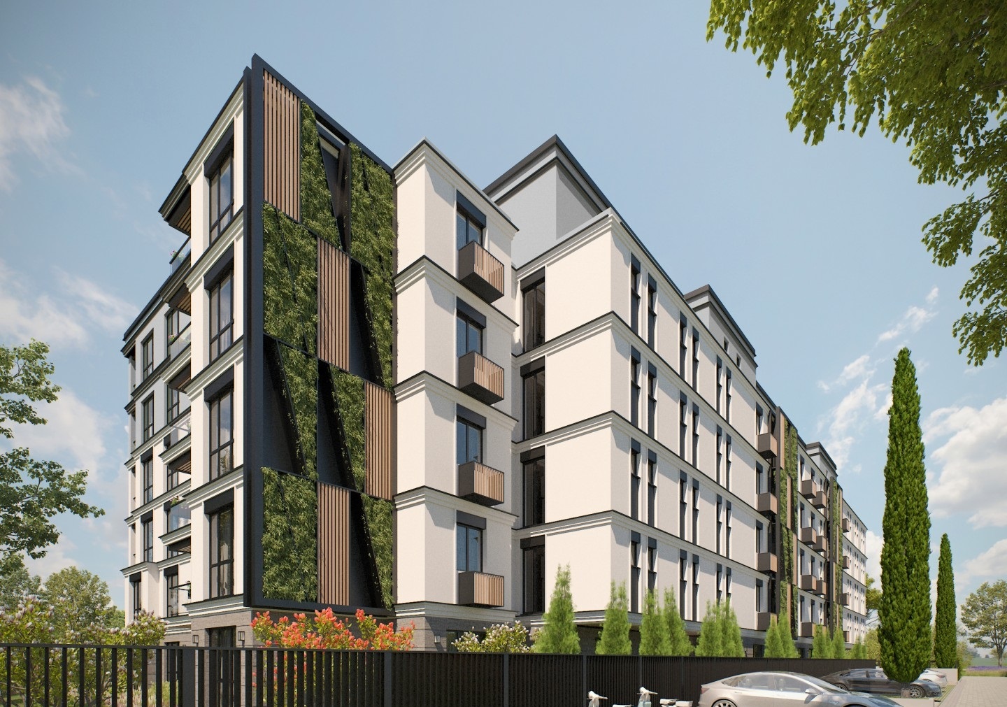 Здание имеет 6 этажей и располагается на участке площадью 4270 м². В составе — 94 апартамента: 61 с одной спальней и 33 с двумя спальнями. Квартиры верхнего этажа отличаются просторными террасами с декоративным озеленением. Все апартаменты имеют удобные планировки, террасы и три варианта экспозиции — южную, восточную и северную. Из окон открываются виды на бассейн комплекса и на парк.