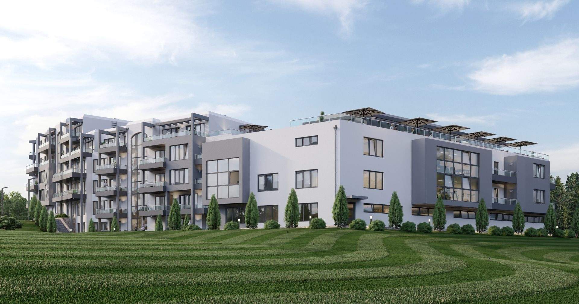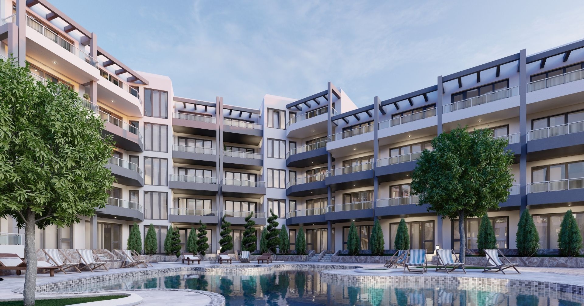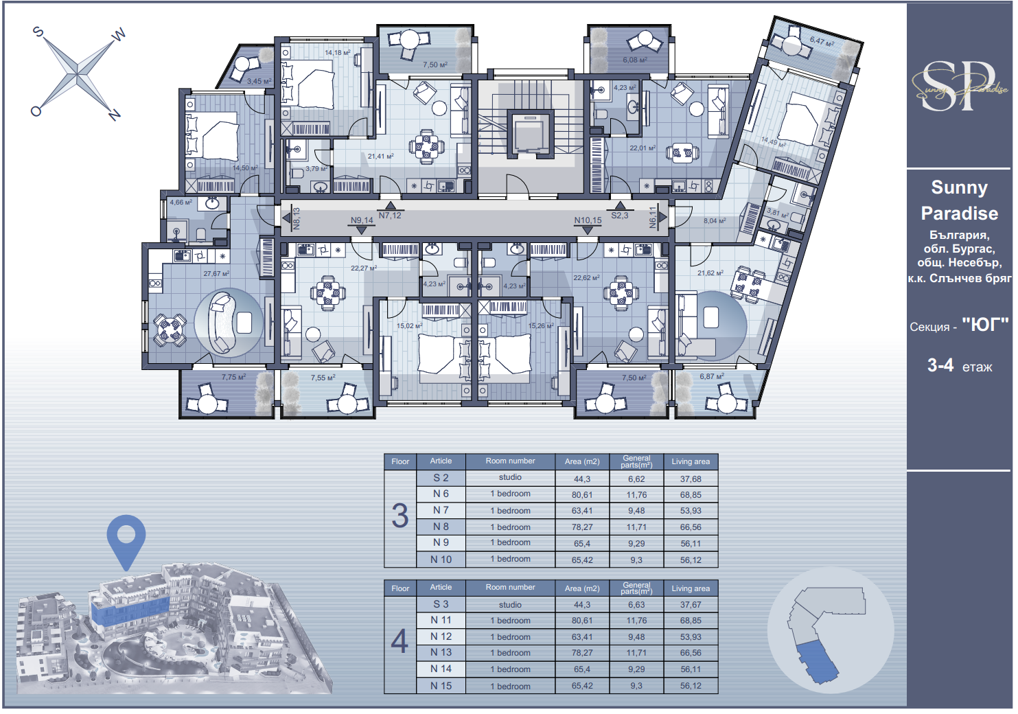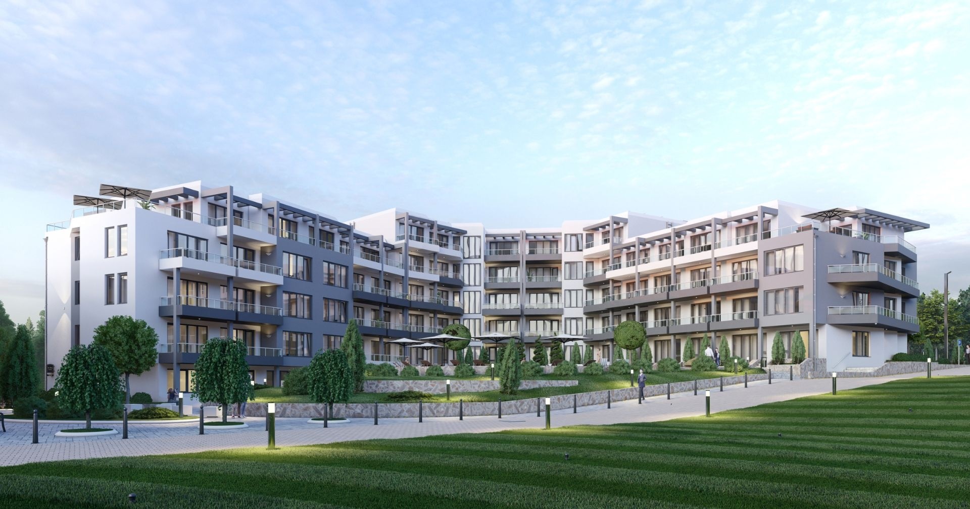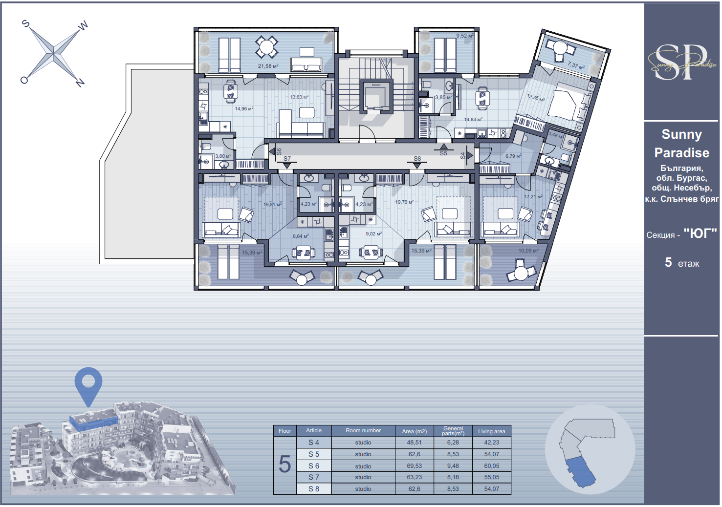 Комплекс находится всего в 500 метрах от круглогодичного супермаркета LIDL и примерно в 1,5 километра от пляжа, что обеспечивает удобную транспортную и бытовую доступность. Здание состоит из пяти этажей и разделено на три секции — Южную, Западную и Северную. В комплексе 86 апартаментов площадью от 40 до 97 м², все предлагаются с отделкой «под ключ» и готовы к меблировке. Такие планировки подходят как для сезонного отдыха, так и для постоянного проживания.