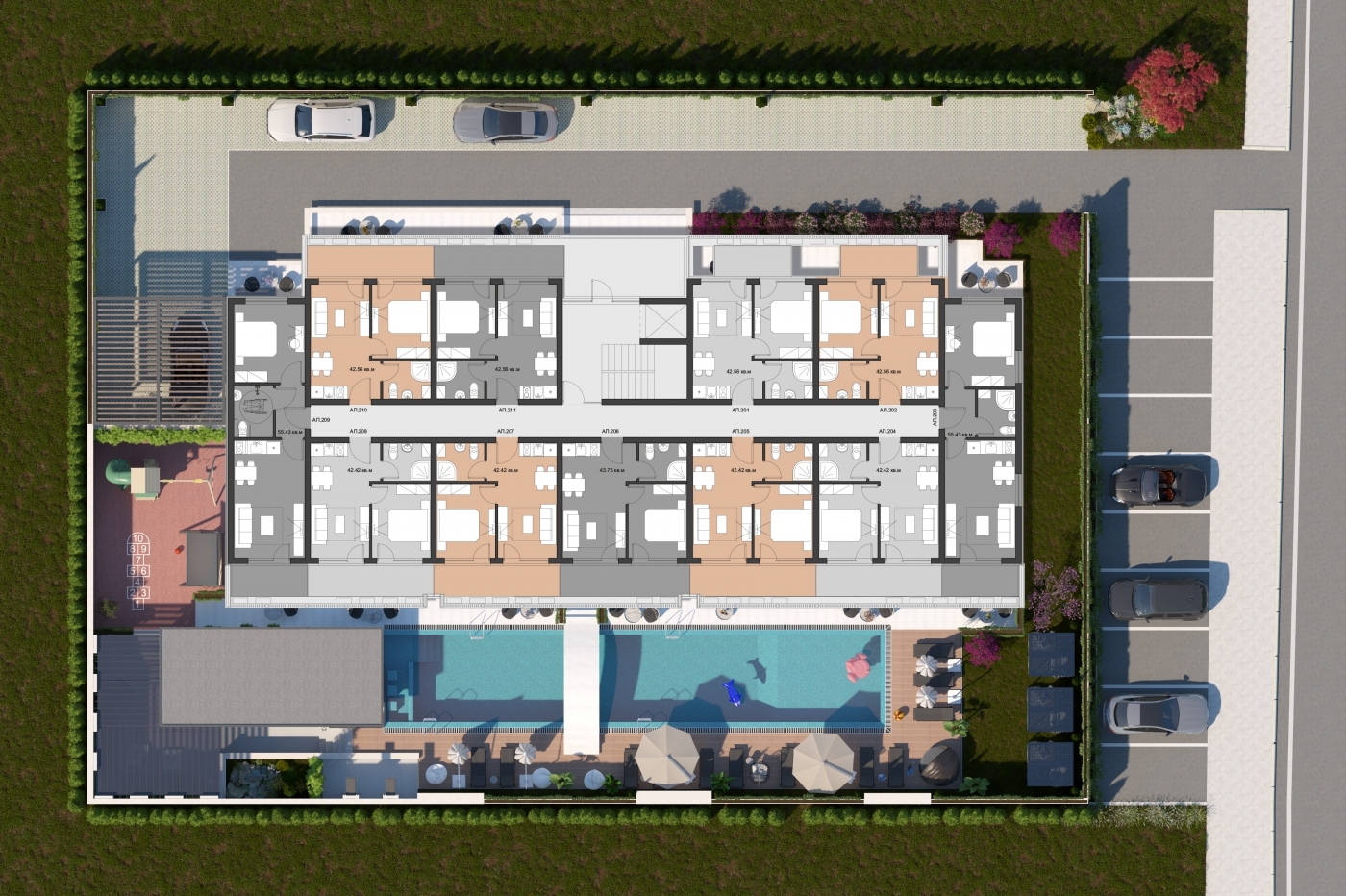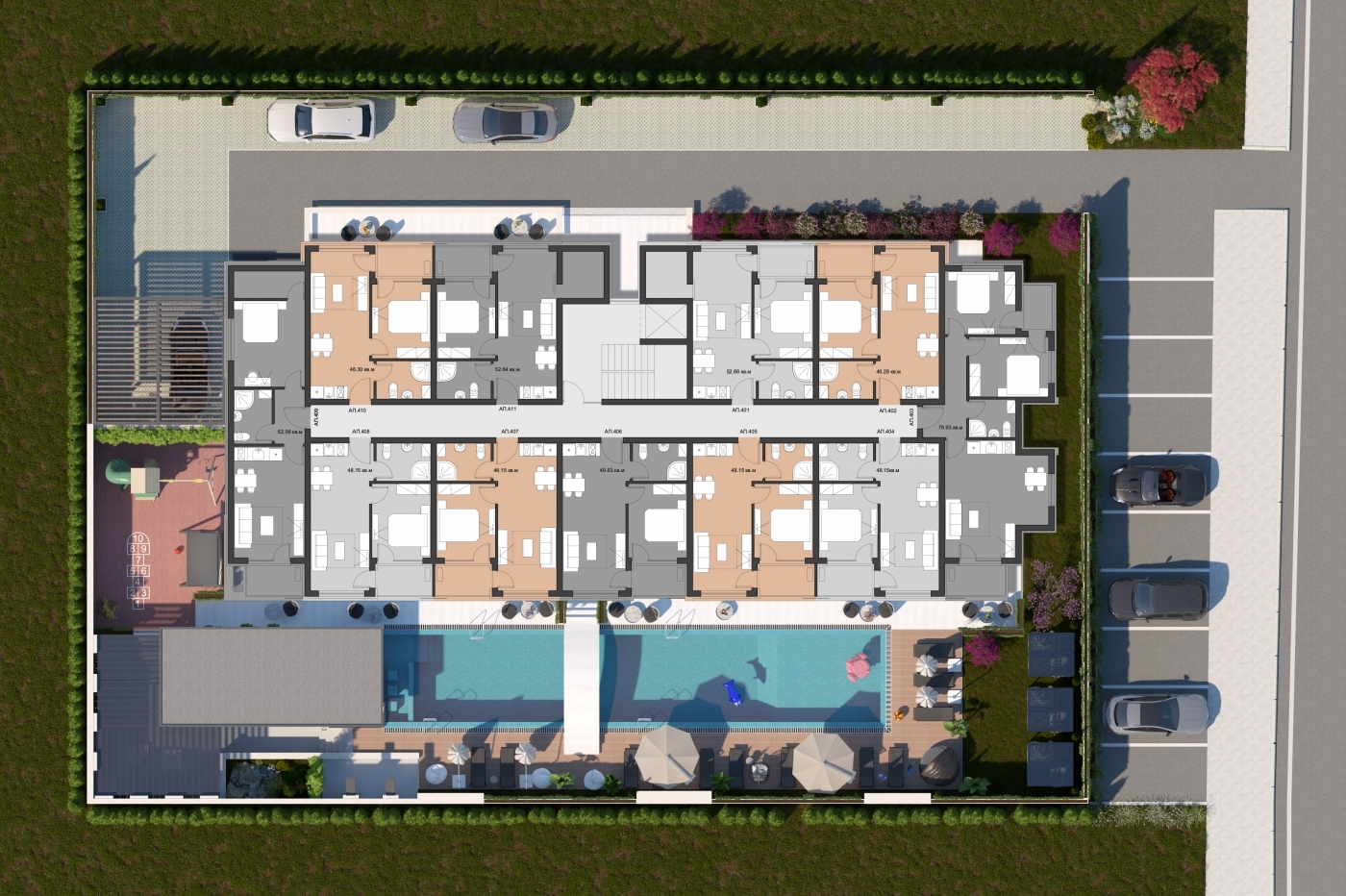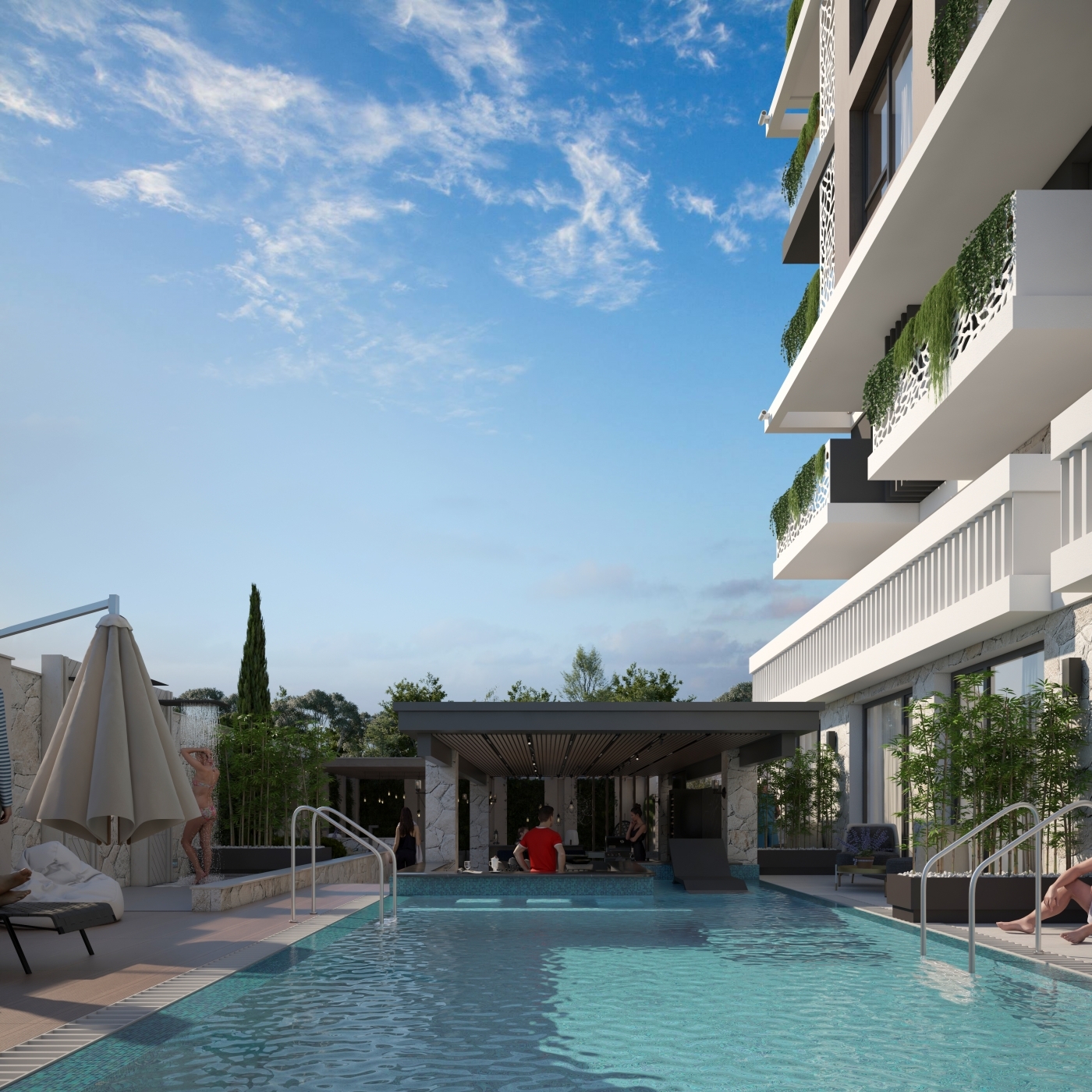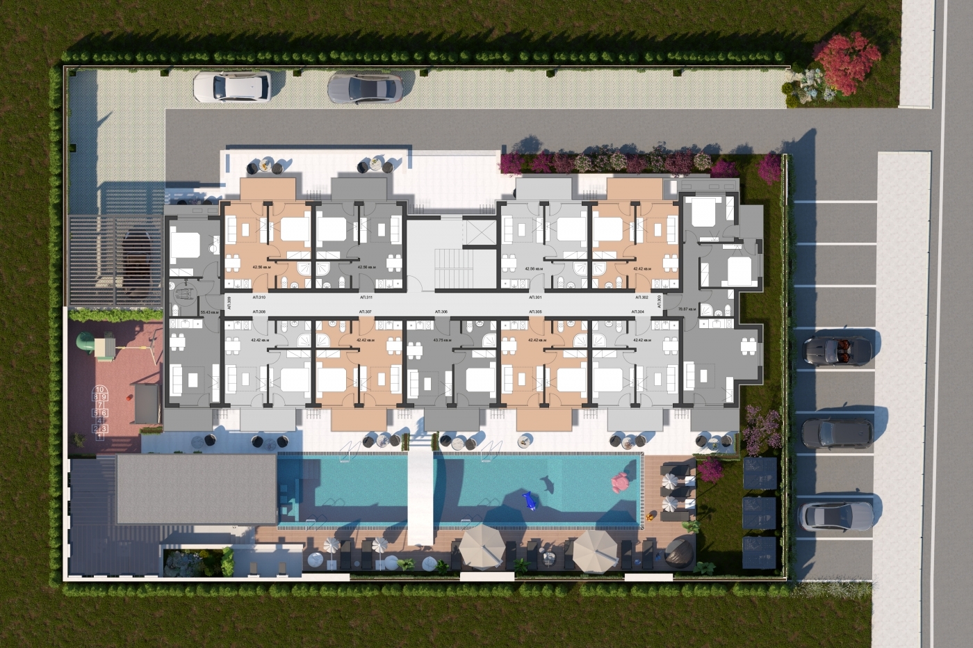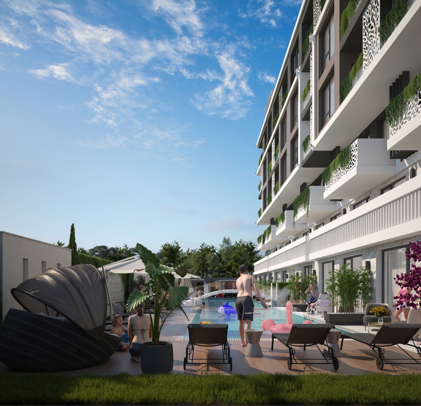 Здание имеет 6 этажей и включает разнообразные по планировкам апартаменты. Квартиры предлагаются с чистовой отделкой и готовы к меблировке. Установлена система отопления и охлаждения — климатик. Качественные материалы и внимание к деталям обеспечивают долговечность и комфорт жилья. В комплексе предусмотрены лифт и современные инженерные системы.