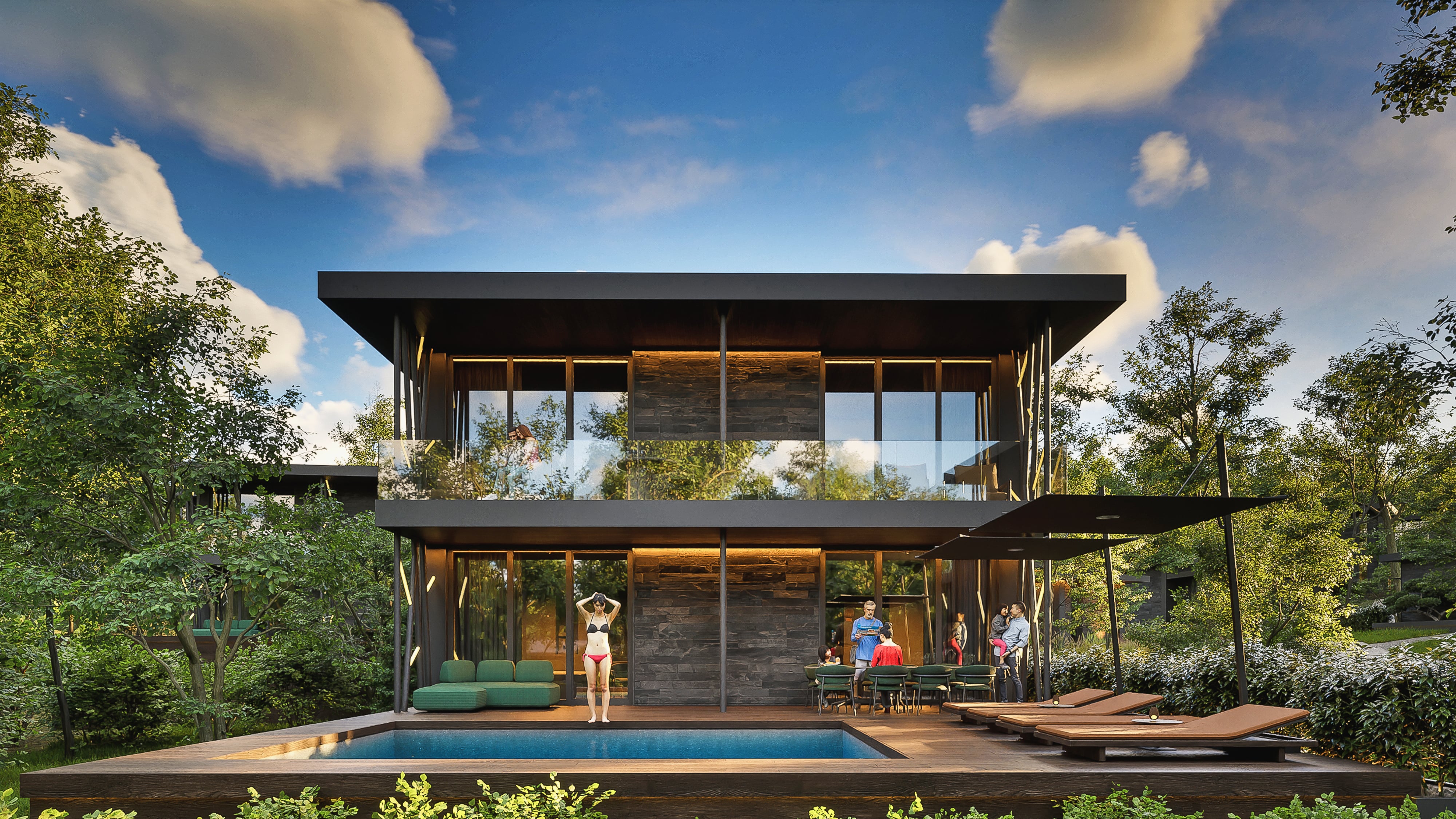 Каждая вилла комплекса выполнена в современном архитектурном стиле и окружена зелёными насаждениями. В интерьерах использованы качественные материалы, дизайнерская мебель и тщательно продуманные планировочные решения. Дома передаются в отделке «под ключ» и оборудованы системой отопления типа климатик для комфортного проживания круглый год.