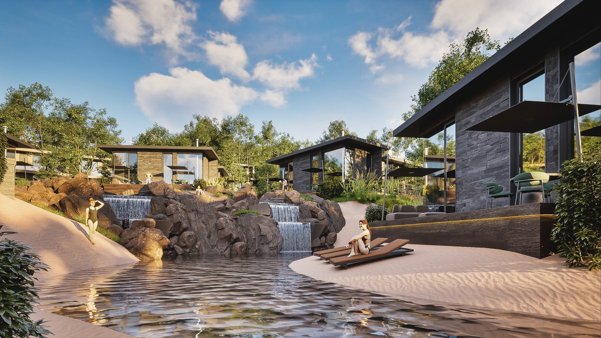 Особенностью комплекса является его уникальное расположение — рядом с живописным озером и небольшим водопадом, создающими атмосферу уединения и гармонии. Здесь можно наслаждаться красотой природы, оставаясь при этом всего в нескольких минутах от городской инфраструктуры и побережья.