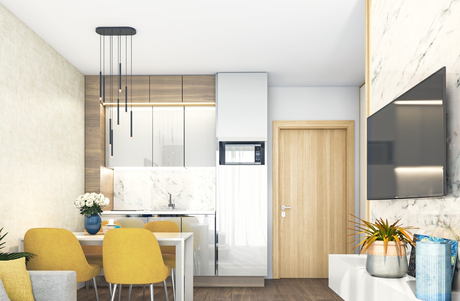 Квартира площадью 54 м² расположена на 2 этаже здания и представляет собой двухкомнатное жильё — просторная гостиная с кухонной зоной, спальня, ванная комната и балкон. Апартамент предлагается с чистовой отделкой и оборудован системой кондиционирования «климатик». Планировка квартиры продумана для комфорта, а большие окна обеспечивают хорошее естественное освещение.