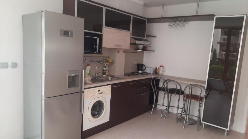 Большая полноценная кухня, большой холодильник, 2 кондиционера (один новый), 2 больших шкафа. Апартамент готов для проживания или сдачи в аренду без необходимости ремонта.